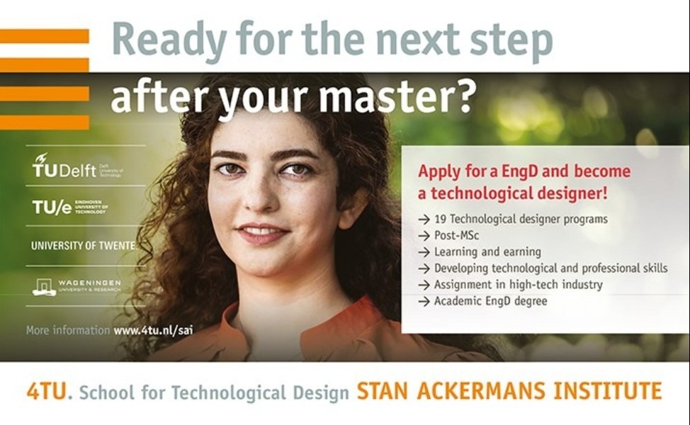 4TU.SAI is a joint initiative of the 4 Dutch universities of technology. We offer two-year full-time paid technological designer programs, leading to an Engineering Doctorate (EngD). An EngD program is a challenging, balanced combination of theory and practice, and will put you on a faster track to a successful career in industry. A MSc degree or equivalent in exact sciences is needed to apply. For more information please visit https://www.4tu.nl/sai/education.